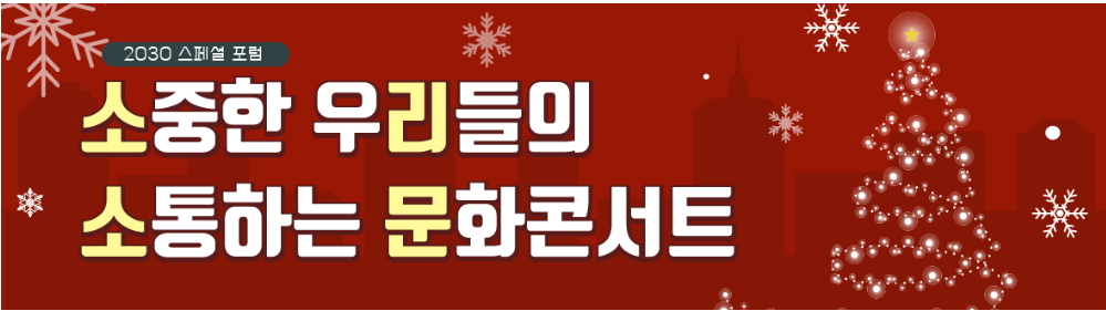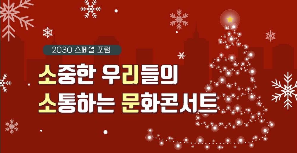 청년세대의 고민과 문제에 대한 해법을 함께 연구하는 2030 스페셜 포럼 <소중한 우리들의 소통하는 문화콘서트>를 개최합니다.