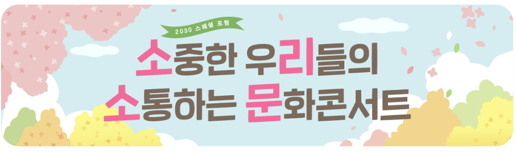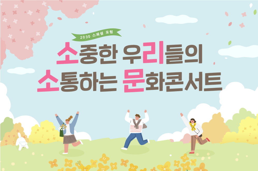 2022년 봄에 청년세대가 함께 모여 청년세대의 고민과 문제에 대한 해법을 연구하는 2030 스페셜 포럼 <소중한 우리들의 소통하는 문화콘서트>를 개최합니다.